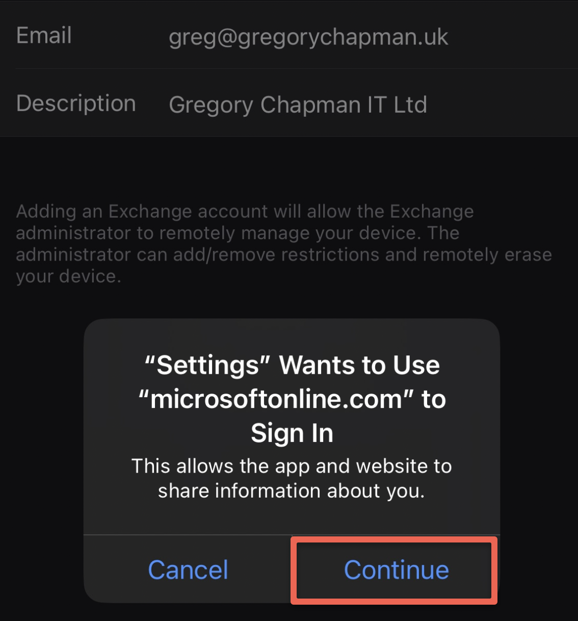- You will be redirect to Microsoft Online to sign in. Click 'Continue'