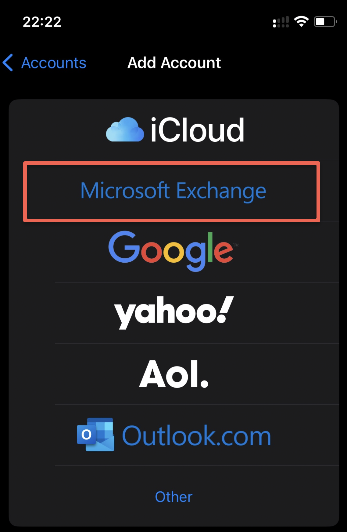 - Choose 'Microsoft Exchange' from the list of account types.