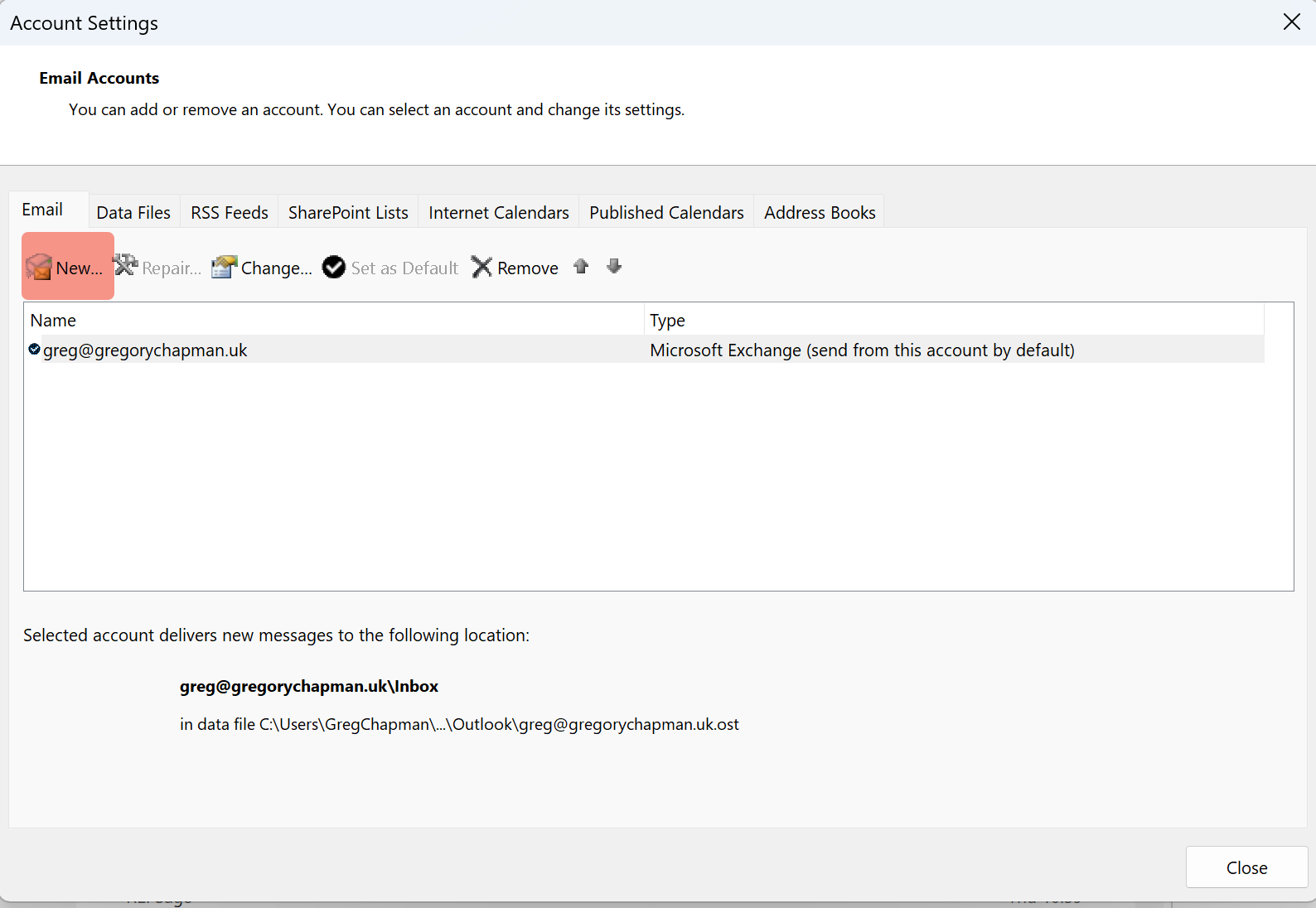 - On the Email tab, click ‘New’ to add a new mailbox.