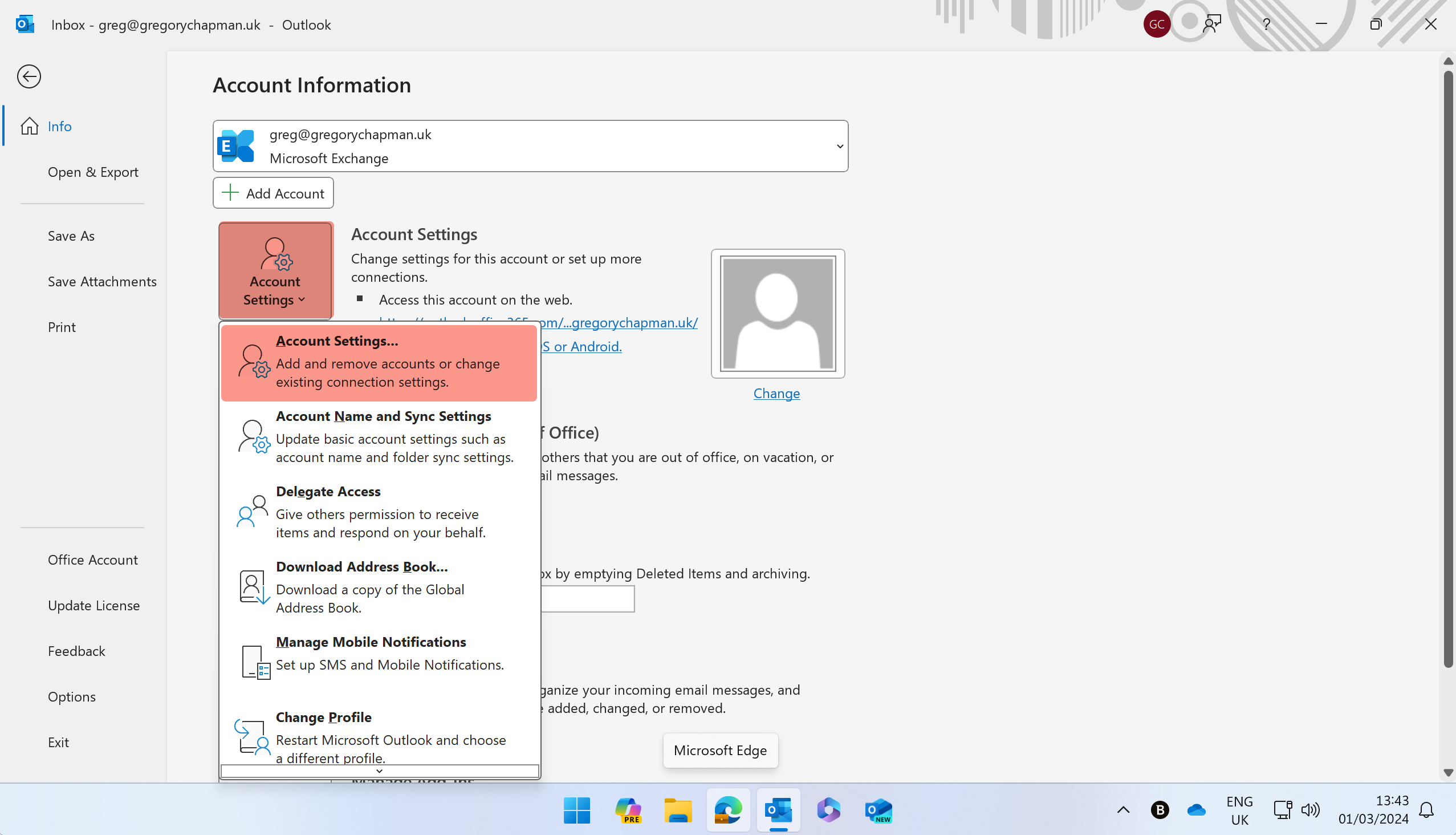 - Click on File, then select ‘Account Settings’, and then ‘Account Settings’.